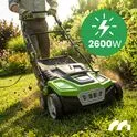 Model MasterLawn-PRO2600 wyposażony jest w wydajny silnik elektryczny o maksymalnej mocy 2600W, zasilany z sieci 230-240V / 50Hz. Zapewnia on stabilną i równą pracę bez spalin, hałasu charakterystycznego dla silników benzynowych oraz bez konieczności uzupełniania paliwa czy oleju.