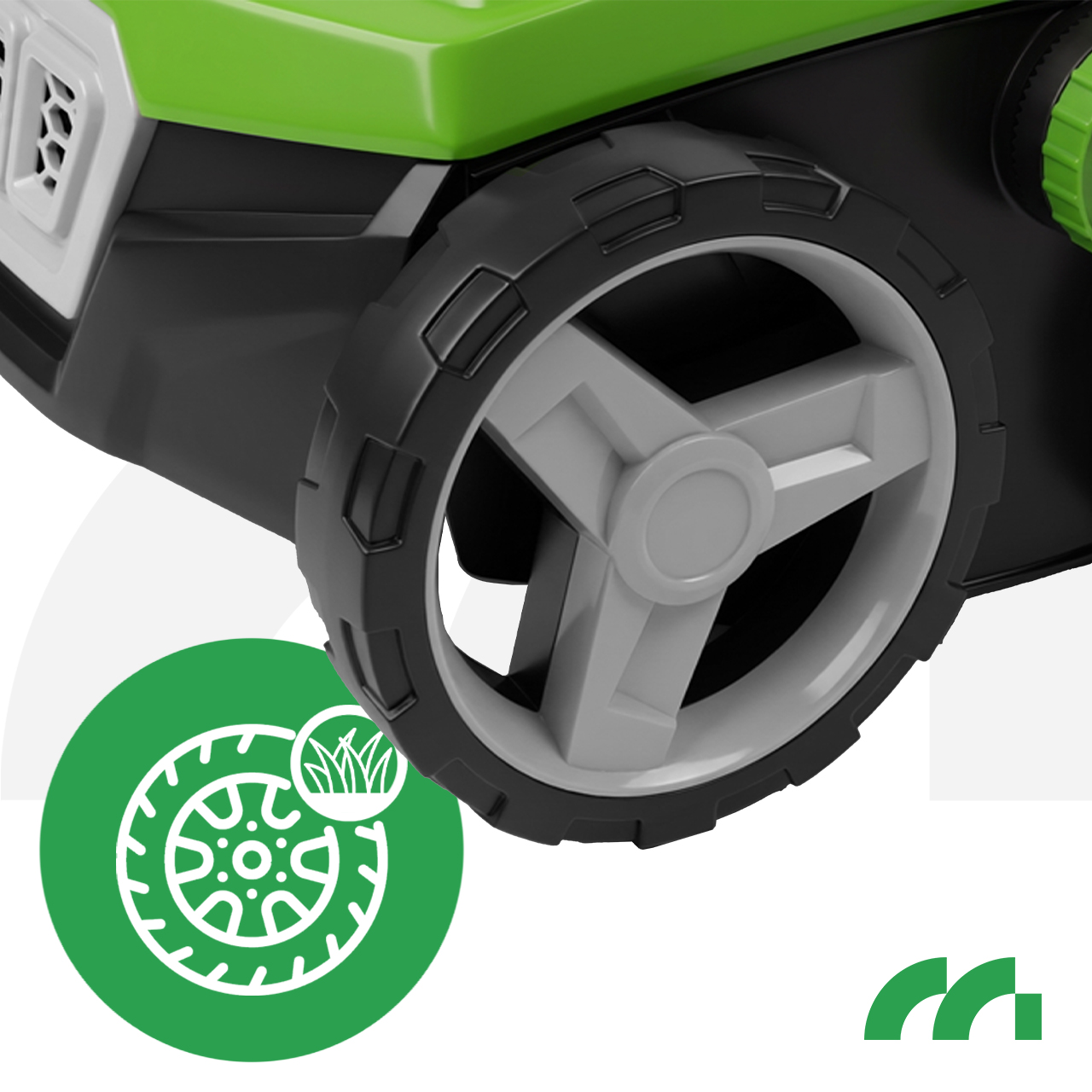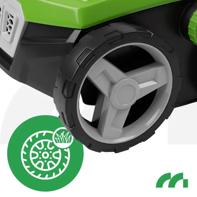 - Stabilne koła - ułatwiają prowadzenie urządzenia i manewrowanie po trawniku, również na nierównym terenie.