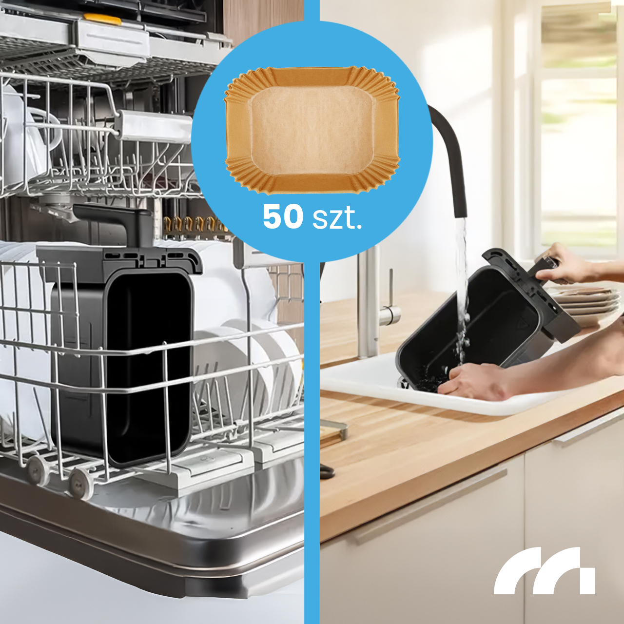 W zestawie otrzymujesz 50 jednorazowych tacek do pieczenia, które dodatkowo ułatwiają utrzymanie czystości po gotowaniu.