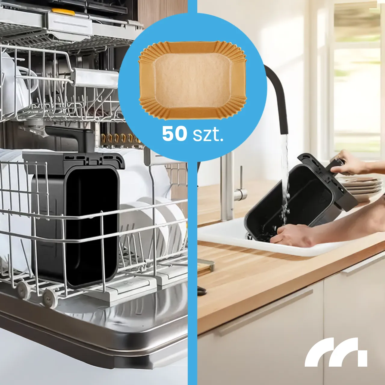 W zestawie otrzymujesz 50 jednorazowych tacek do pieczenia, które dodatkowo ułatwiają utrzymanie czystości po gotowaniu.