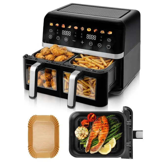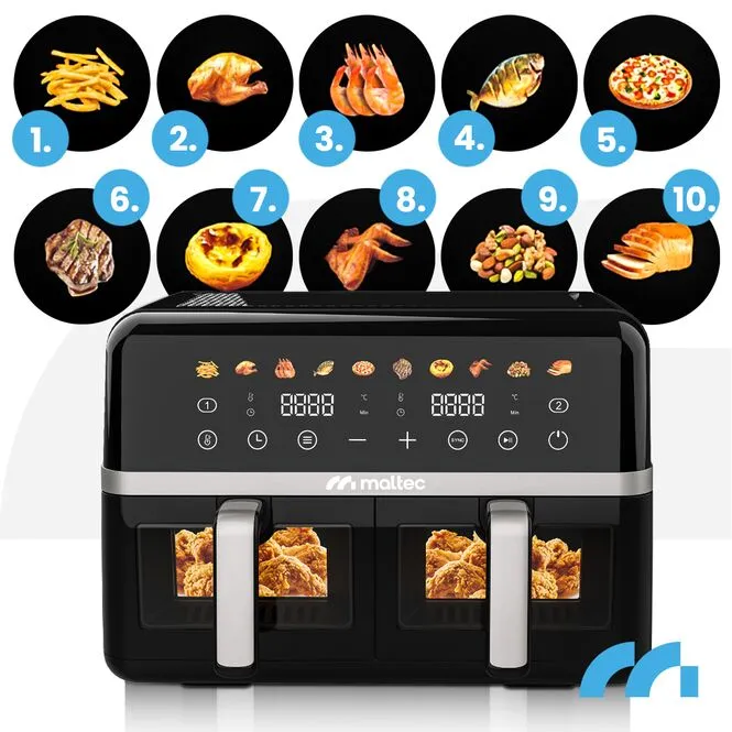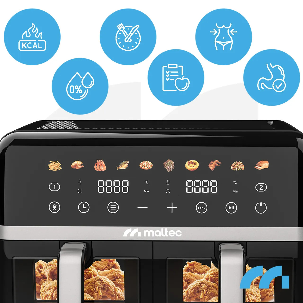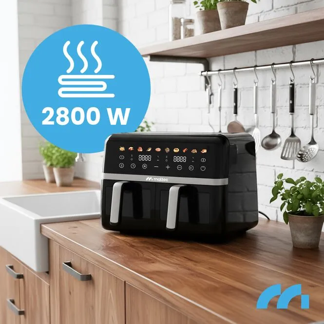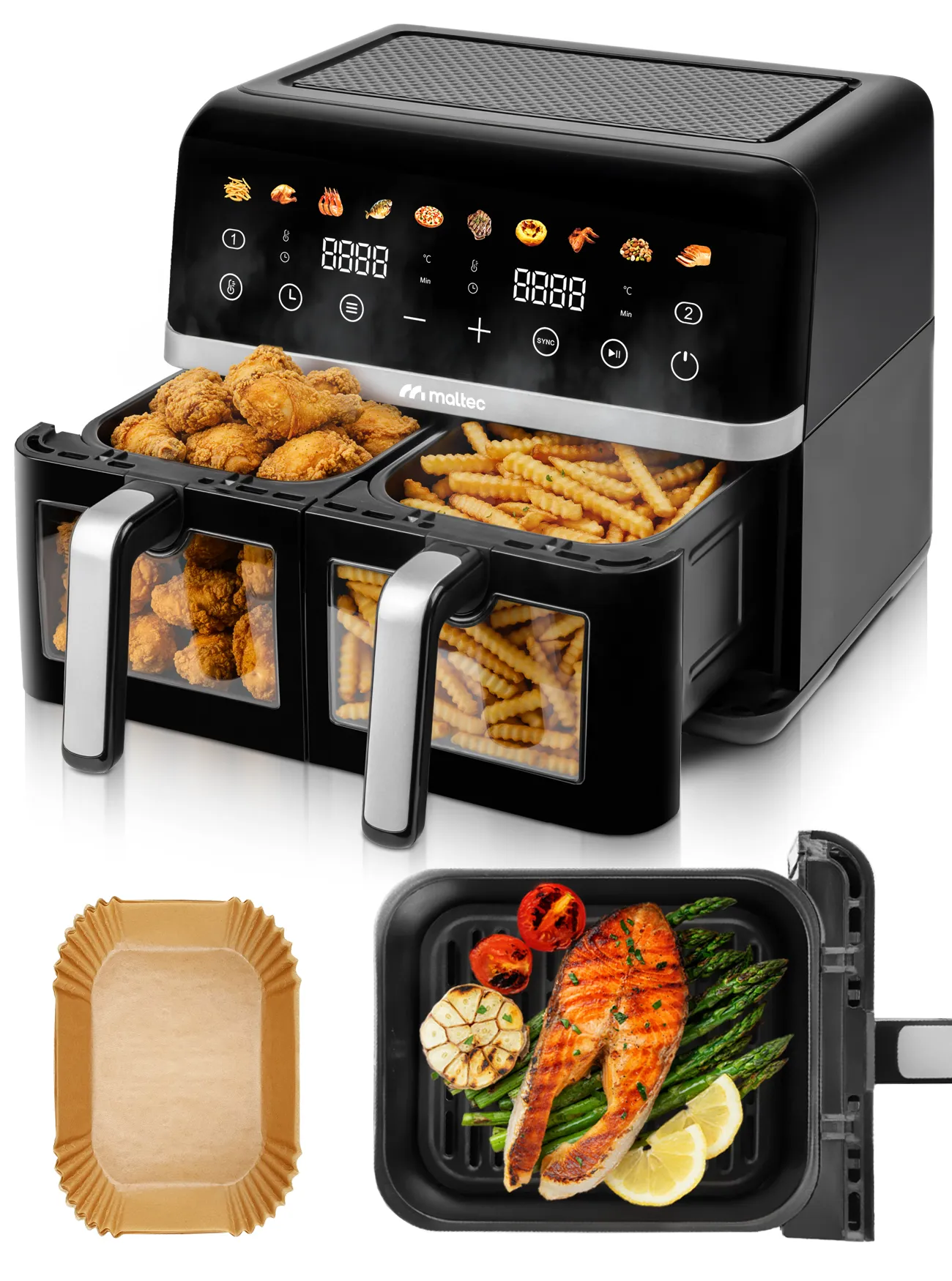 Frytkownica beztłuszczowa MalTec AirFryer2800W-10L to zdrowy sposób na przygotowanie lekkich i smacznych potraw: frytek, skrzydełek, kurczaka, ryb, warzyw, pieczywa czy deserów. Dwie niezależne komory pozwalają gotować dwa różne dania naraz, a okienka kontrolne umożliwiają podgląd bez otwierania koszy.