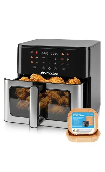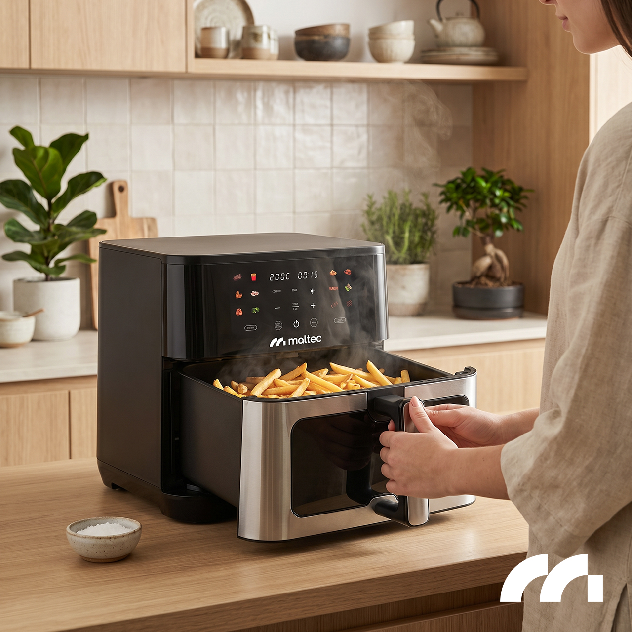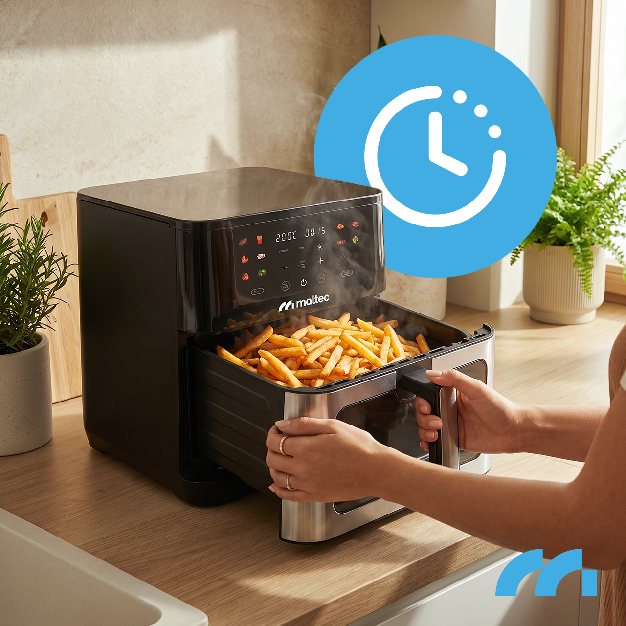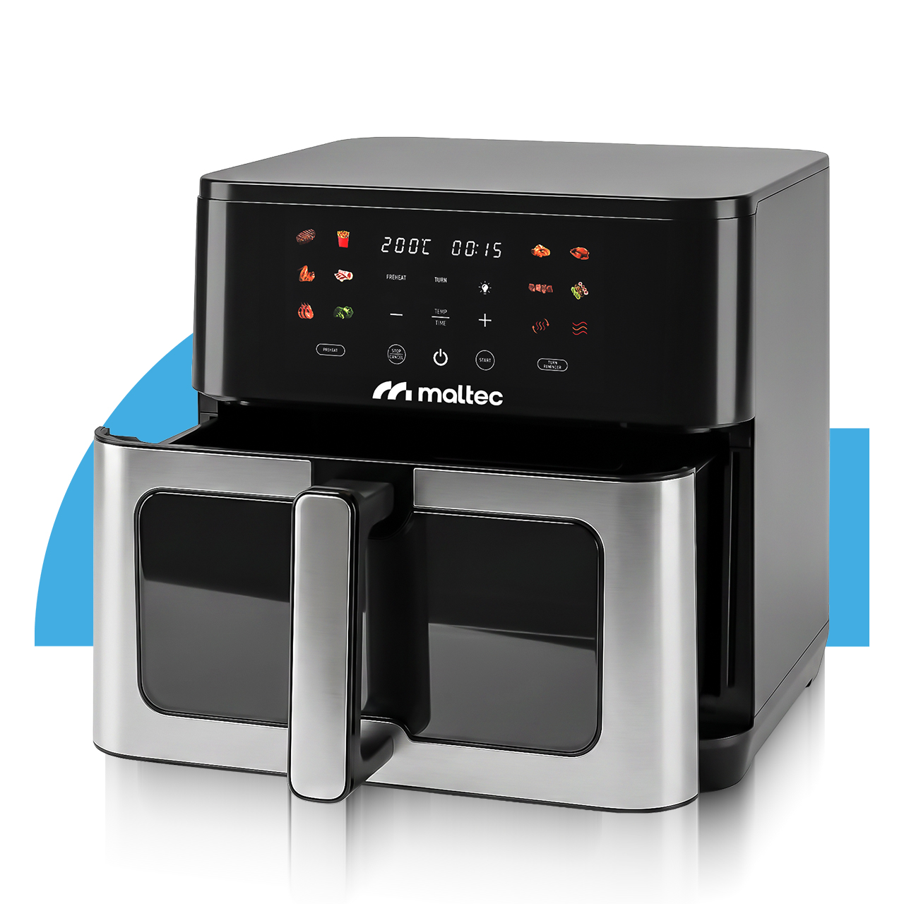 Frytkownica beztłuszczowa MalTec AirFryer2000W-10L to zdrowy sposób na przygotowanie lekkich i smacznych potraw. Dzięki technologii szybkiej cyrkulacji gorącego powietrza urządzenie umożliwia smażenie frytek, kurczaka, ryb, warzyw, a nawet pieczenie ciast bez konieczności użycia oleju.