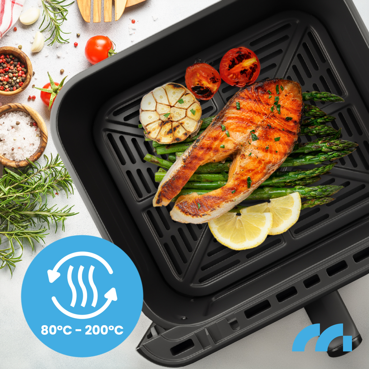 Możesz regulować temperaturę ręcznie w zakresie od 80°C do 200°C i używać timera, który monitoruje niezbędny czas gotowania. Temperaturę dostosowujesz do rodzaju przygotowywanego dania, co pozwala na idealne dopasowanie parametrów smażenia, pieczenia czy grillowania dla każdego przepisu.