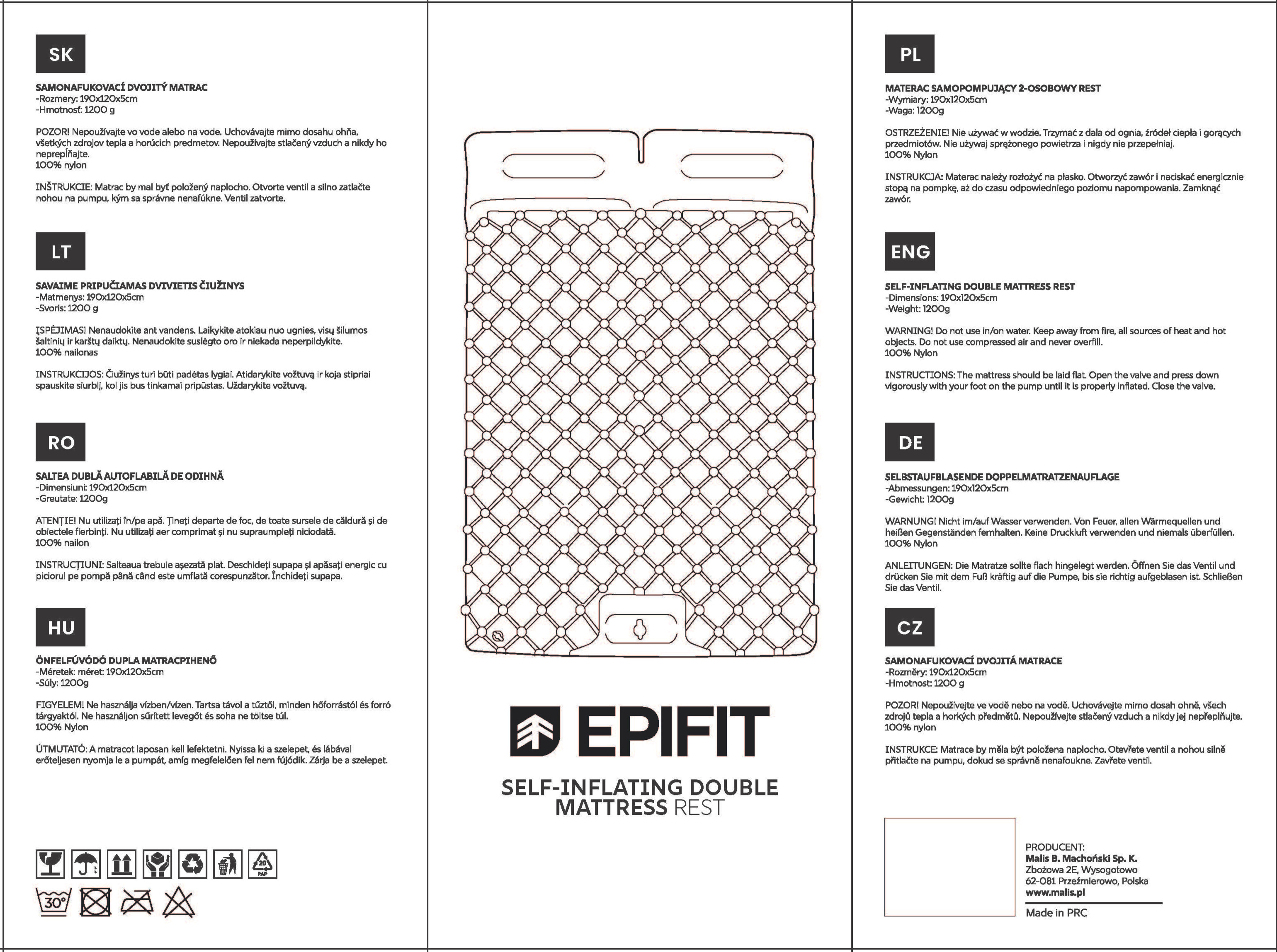 Po rozłożeniu osiąga wymiary 195 × 120 cm i grubość 5 cm, co zapewnia komfortowy wypoczynek w terenie dla dwóch osób. Po złożeniu jest kompaktowy i łatwy do przenoszenia – zmieści się w plecaku.
