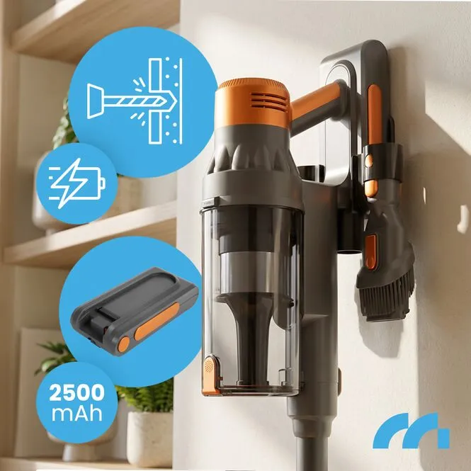 W zestawie znajduje się uchwyt ścienny (stacja dokująca), który umożliwia bezpieczne i estetyczne przechowywanie odkurzacza. Dzięki temu urządzenie zawsze będzie pod ręką i gotowe do pracy, a w Twoim domu zapanuje porządek.