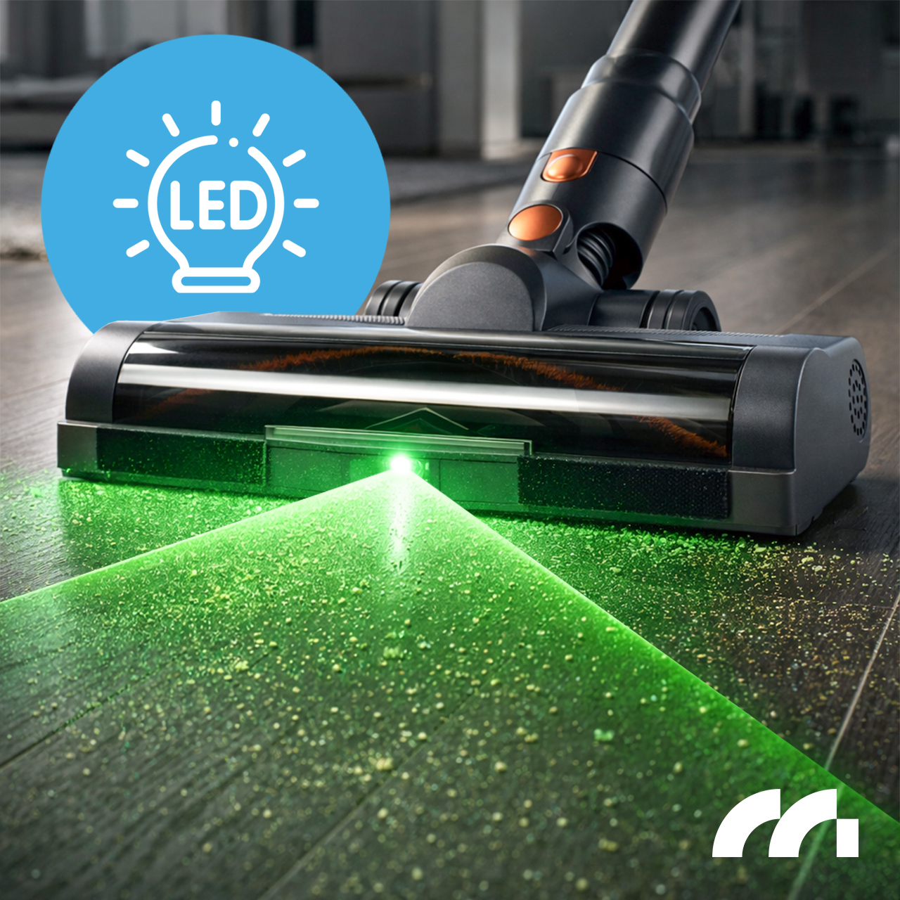 • Lepsza widoczność - światło LED dokładnie oświetla podłogę, umożliwiając sprzątanie w trudno dostępnych i ciemnych miejscach (np. pod łóżkiem lub sofą).