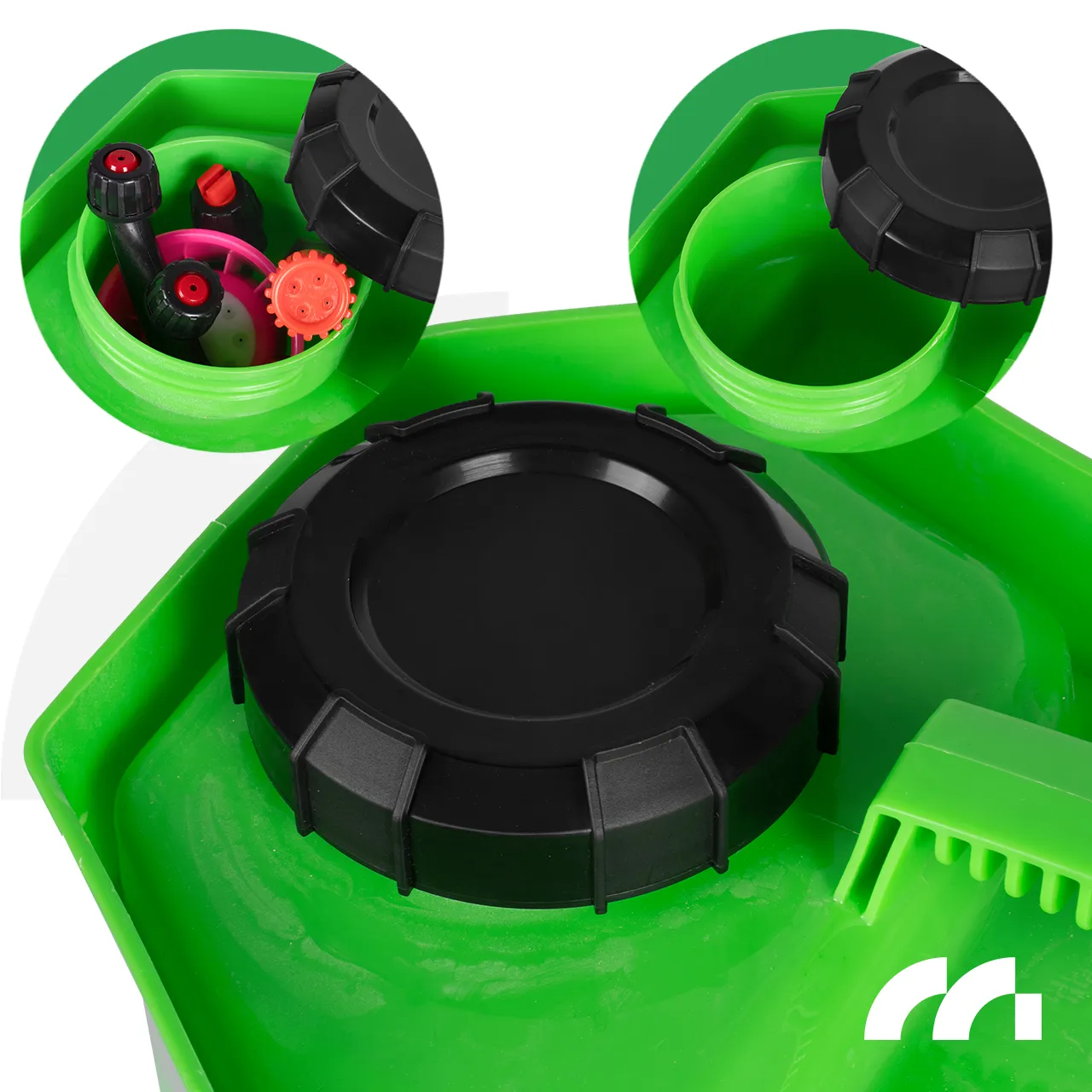 Zbiornik wykonano z PP, czyli materiału, który dobrze znosi typowe środki stosowane w ogrodzie.