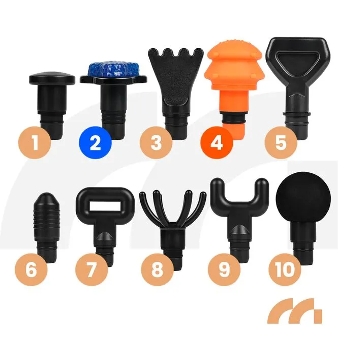 Pistolet oferuje aż 10 końcówek masujących, dzięki czemu jeden pistolet zastępuje profesjonalny zestaw fizjoterapeutyczny. Każda z nich została zaprojektowana do innej grupy mięśniowej lub innego rodzaju pracy – od punktowej, przez głęboką, po szeroką i łagodną.