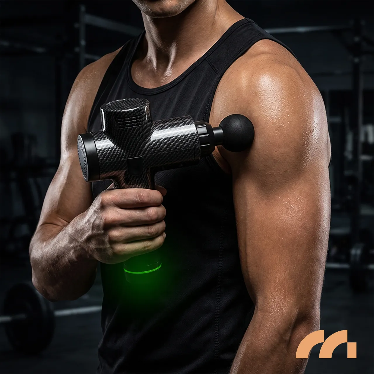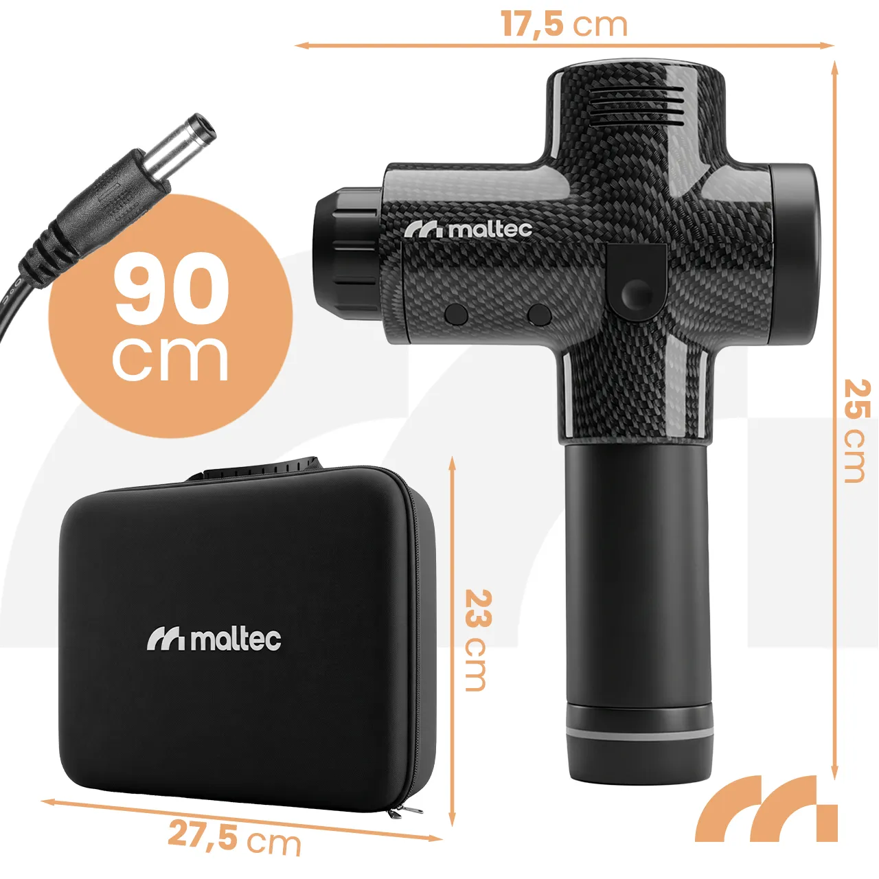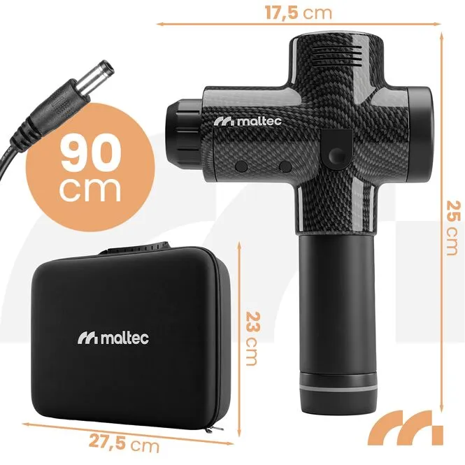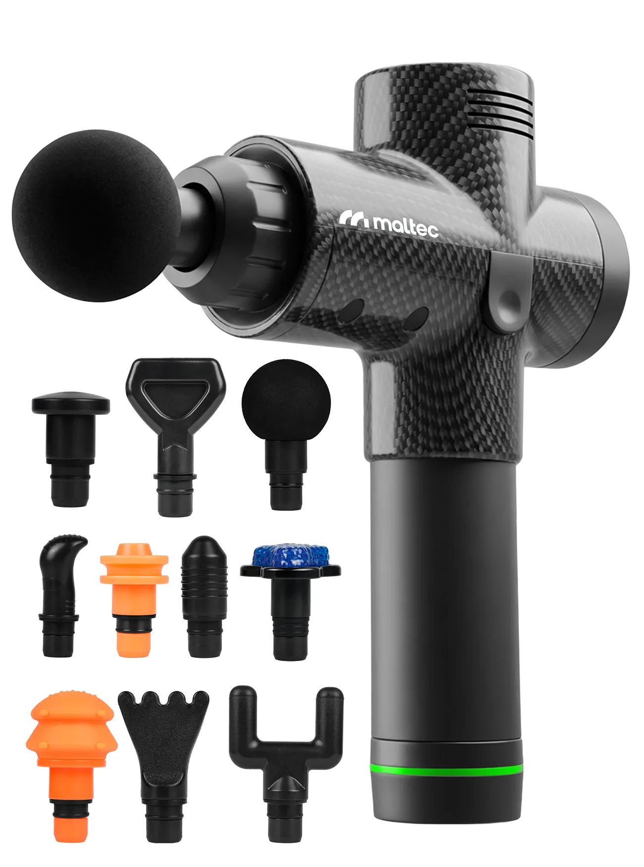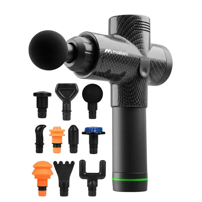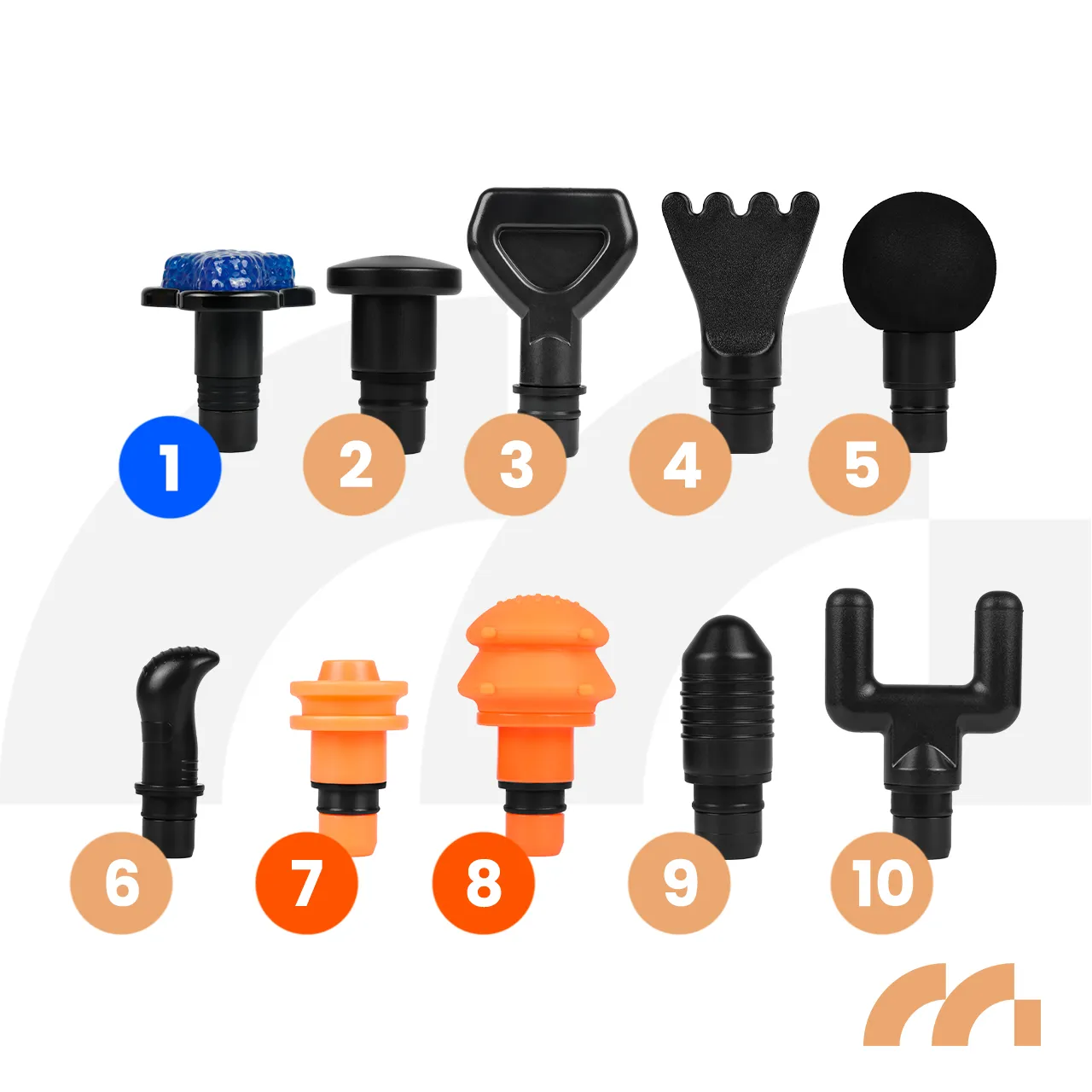 Pistolet oferuje aż 10 profesjonalnych końcówek, dzięki czemu jest w pełni przygotowany do masażu każdej grupy mięśniowej — od delikatnych partii po duże obszary wymagające intensywnej pracy.