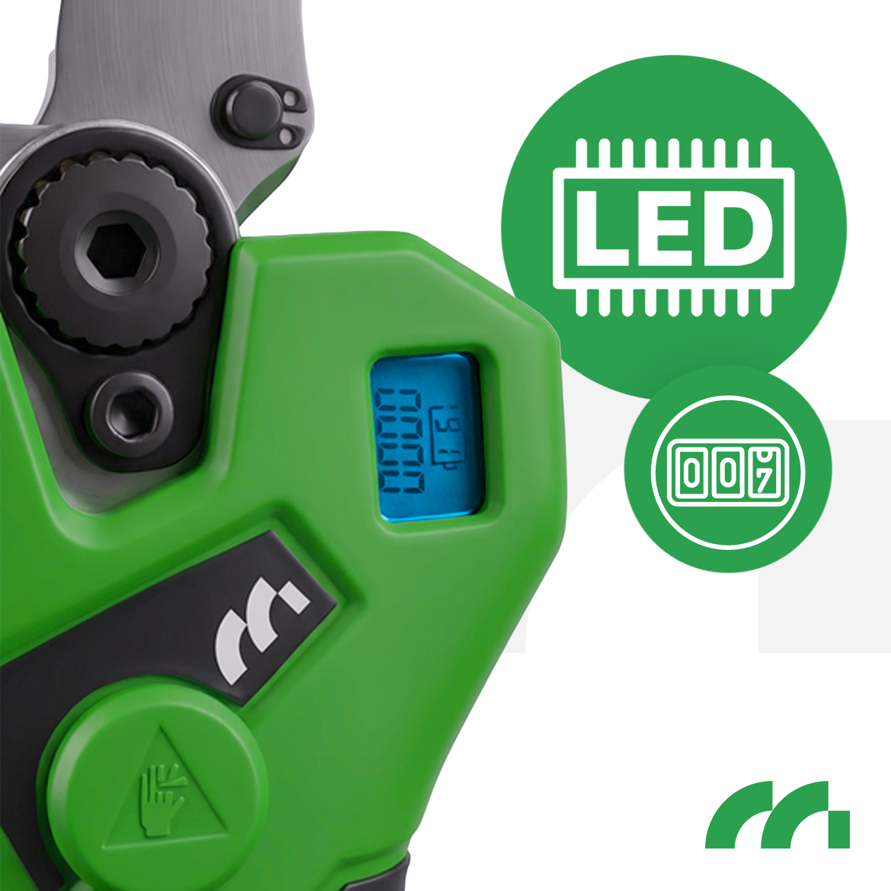 Sekator MasterCut500W został wyposażony w czytelny wyświetlacz LED, który zwiększa kontrolę i komfort pracy. Ekran informuje o aktualnym poziomie naładowania akumulatora oraz o liczbie wykonanych cięć od momentu uruchomienia urządzenia.
