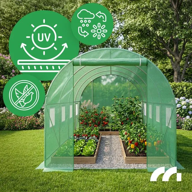 Poszycie tunelu zostało wykonane w grubej folii typu PE (o gramaturze 140g/m2) wzmocnionej dodatkowo wtopioną siatką PP. Dzięki temu folia jest jeszcze bardziej odporna na uszkodzenia mechaniczne, a przy tym doskonale przepuszcza światło i tworzy idealny mikroklimat do wzrostu Twoich ekologicznych upraw.