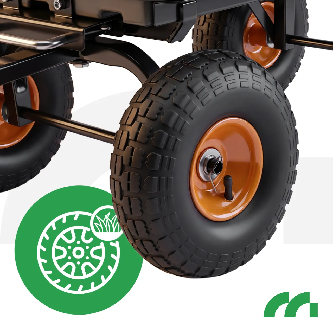 Gumowe, pompowane i łożyskowane koła zapewniają stabilność i równowagę w czasie przewożenia przedmiotów, a także ułatwiają jazdę po nierównej powierzchni. Oferowane koła z łatwością pokonają praktycznie każdy rodzaj nawierzchni. Gumowe bieżnikowane opony zapewniają dobrą przyczepność a dętka amortyzację.