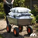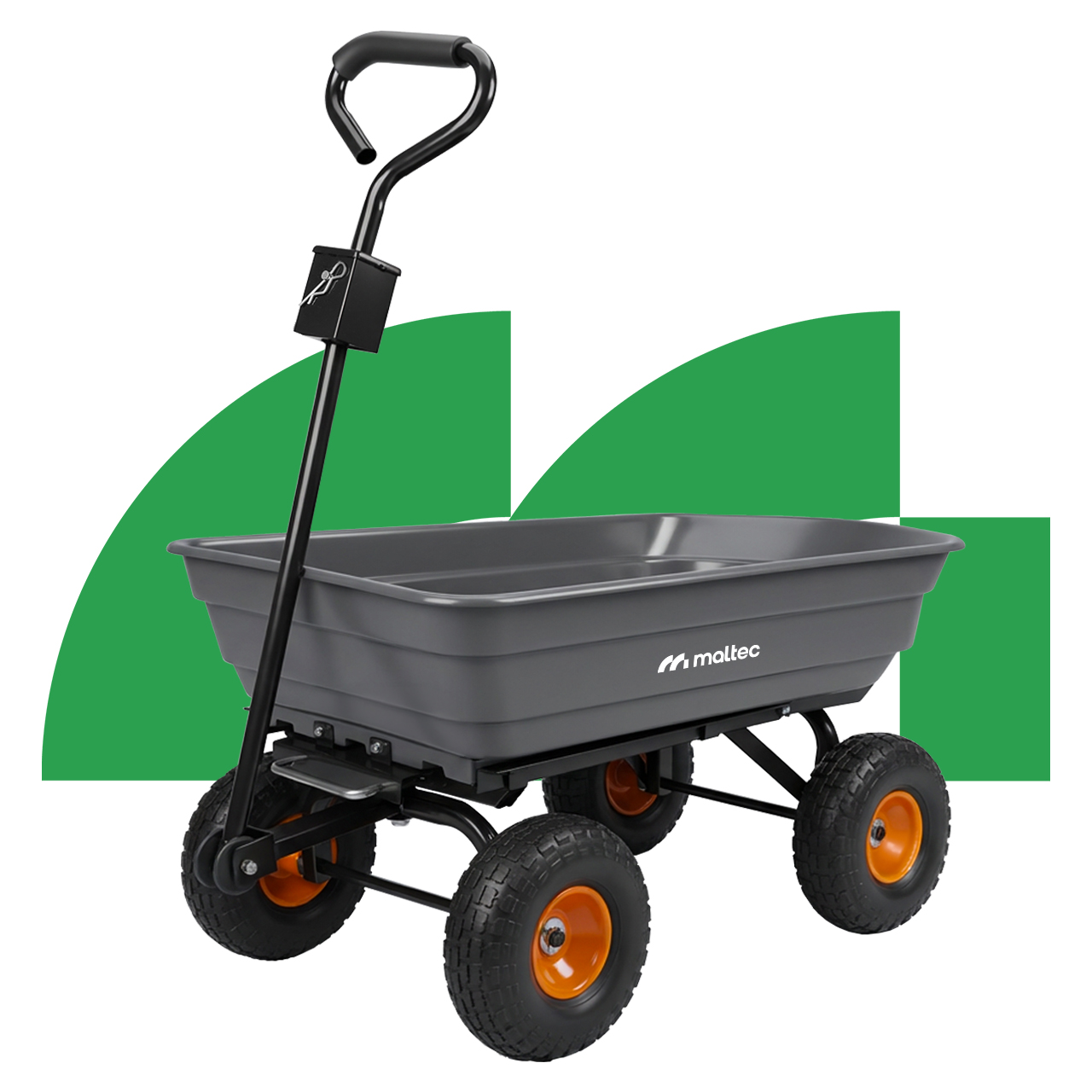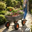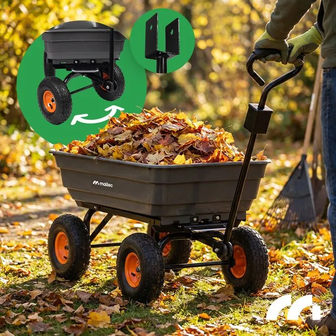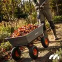 Wózek ogrodowy posiada funkcję wywrotki, która pozwala w kilku sekund opróżnić przyczepkę. Ogromnie przydatna funkcja pozwalająca na przyspieszenie prac z wykorzystaniem wózka. Raz dwa opróżnisz załadowany wózek.