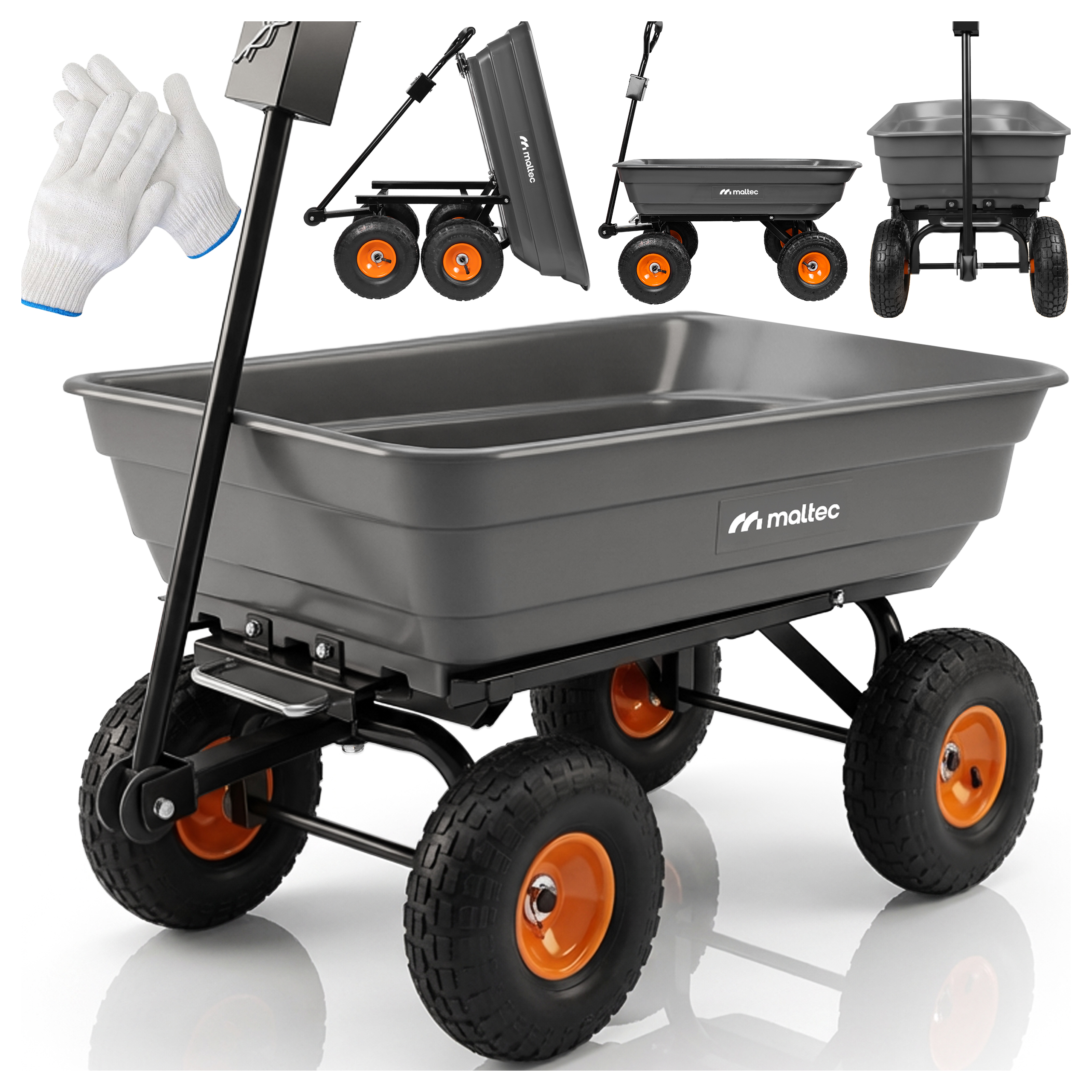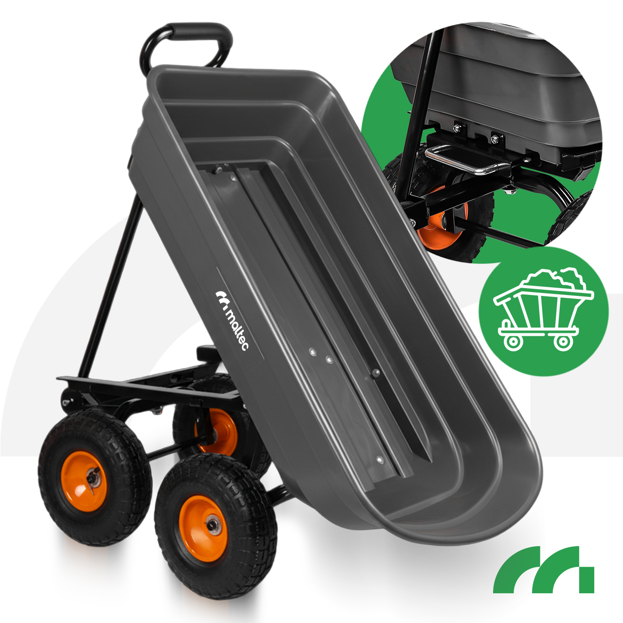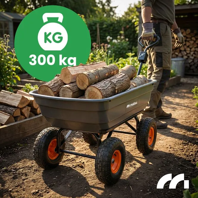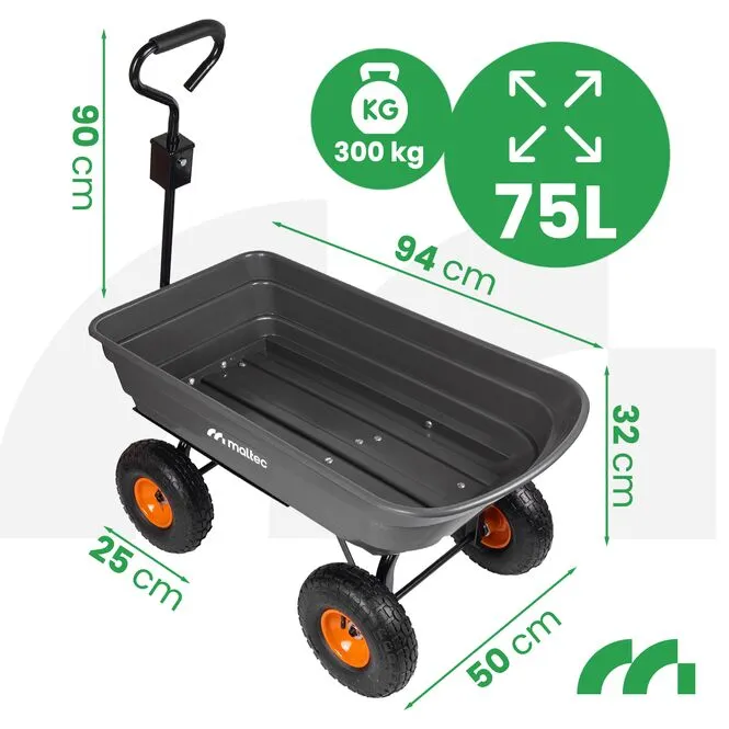 ◾ MOCNA WYTRZYMAŁA KONSTRUKCJA ◾ UDŹWIG DO 300KG ◾ POJEMNOŚĆ 75 L ◾ UCHWYT DWUFUNKCYJNY ◾ WYWROTKA ◾ SKRĘTNA OŚ ◾ POMPOWANE KOŁA